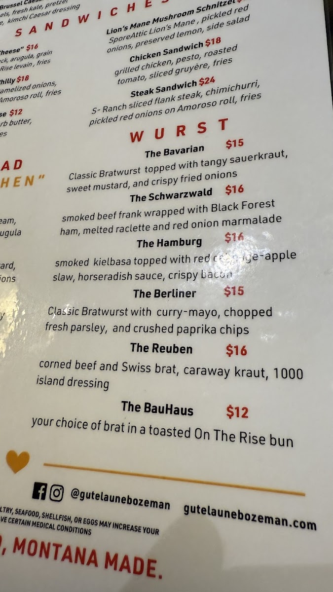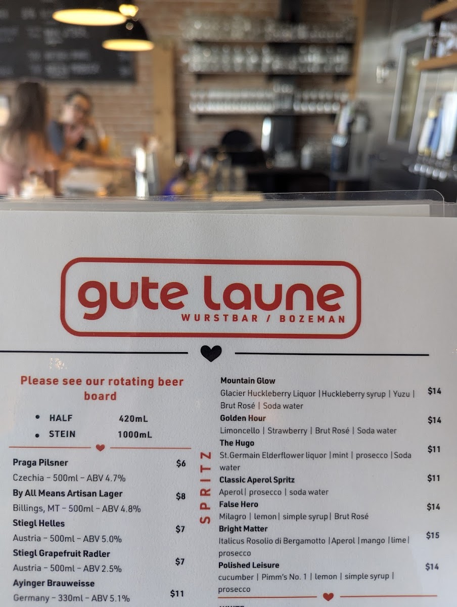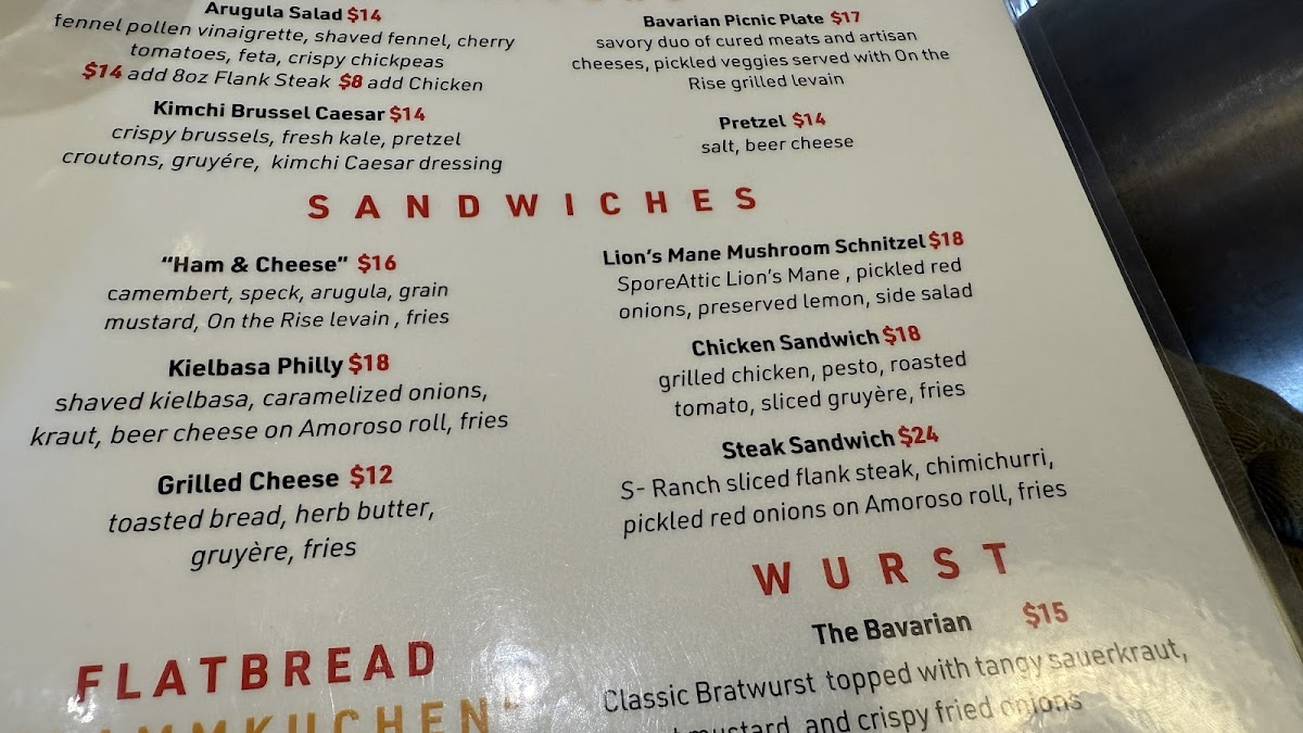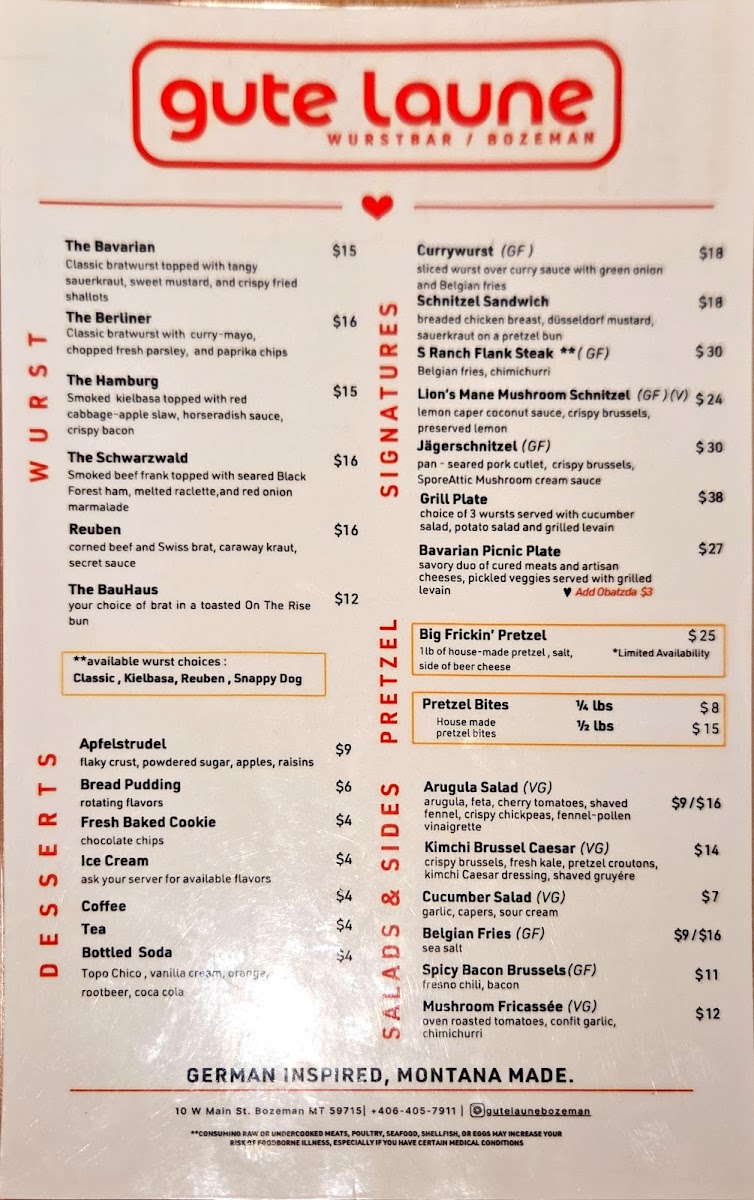 Gute Laune’s menu offers a delightful blend of traditional German flavors with creative twists, making each visit a culinary adventure. The Flammkuchen selection, featuring Wurstlust, What The Speck?!, and Truffle PigHarvest, stands out for its crisp, flavorful crusts topped with inventive combinations. For younger diners, the Kids Menu includes approachable favorites like Apple Juice, Kinder Fries, Kinder Wurstchen, Apple Wedges W/ PB, and Kids Tenders, ensuring the little ones are well catered to. Signature dishes such as Steak Frites, Duck Flammkuchen, Currywurst, Lion's Mane Schnitzel, and Jaeger Schnitzel showcase the kitchen’s commitment to rich, hearty flavors. The Weideplatte section, with Obatzda, Picnic Plate, and Grill Plate, offers a satisfying sampler for those seeking variety. Wurst enthusiasts will find tempting options in The Schwarzwald, The Bavarian, The Hamburg, The Berliner, and The BauHaus, each presenting a distinct taste of Germany. Appetizers like the Bavarian Picnic Plate, Squash Salad, Kimchi Brussel Caesar, and Obatzda & Pretzel provide light yet flavorful starters, while sandwiches such as Kielbasa Philly, Chicken Sandwich, Lion's Mane Schnitzel, Frikadellen Sub, and Grilled Cheese cater to more casual cravings. Complementing the main dishes, sides including Grilled Bread, Squash Salad, Pretzel Bites 1\2 Lbs, Fries - Shareable, and Beer Cheese round out the experience with perfect accompaniments. To finish, the dessert offerings of Apfelstrudel and Bread Pudding provide a sweet, comforting conclusion to the meal. Overall, Gute Laune’s menu balances authenticity with playful innovation, ensuring that every guest finds something memorable, whether indulging in rich schnitzels, savoring inventive flammkuchen, or sharing a generous plate of wurst.